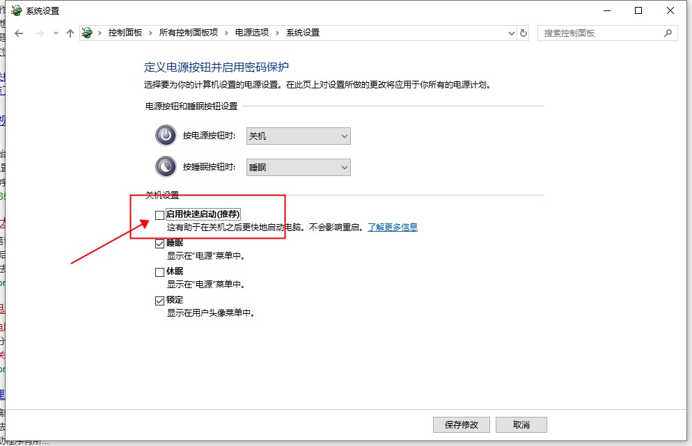 第六步、如果可以正常关机后,我们再打开开机进入到上图这个界面,将刚才去掉勾选的“启用快速启动(推荐)”这一项前面的框勾选上,记得也是要点击保存修改按钮哦。