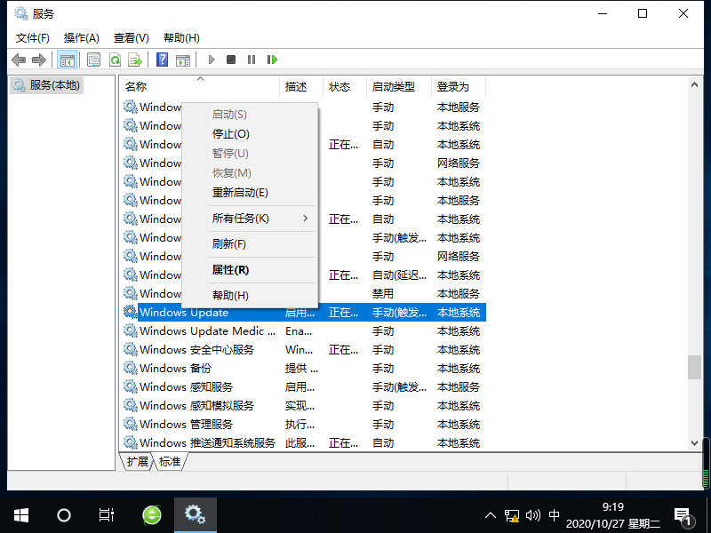 5、接着我们在回到服务页面,右键启动Windows Update。
