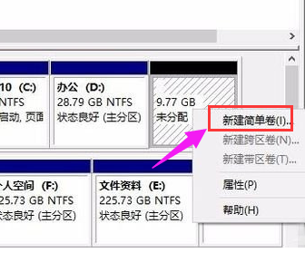 6.压缩完成后,在磁盘分区的位置就会多出一个未分配的区域,我们使用鼠标右键选择【新建简单卷】。