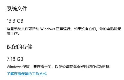 6、打开后即可查看系统文件的大小了。(这里系统文件和保留的存储是必要的)