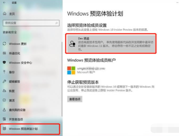 2.如果您的计算机符合这些条件,再看看原来的Windows10是否是最新的21H2版本,如果没有,则首先升级到最新的版本。如果它是最新版,请在windows10的预览体验计划中选择“Dev”频道,这里将要求绑定相关的微软帐号,按照提示一步一步来完成,然后点击查看更新,将推出windows11更新。接下来是等待下载安装更新,根据您的网络速度,通常1小时左右就可以搞定更新,中间还会重新启动几次电脑,不要紧张,台式机最好不要断电,以免出现未知错误。