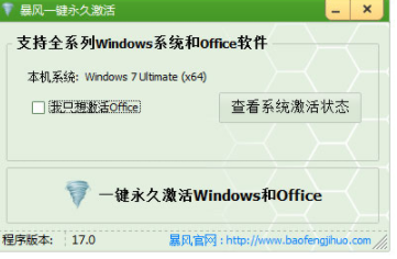 2,点击一键永久激活Windows和Office。由于暴风win7激活工具属于新的激活工具,还没有完全经过各大杀毒软件的检测,为了广大用户的激活成功率,最好先关闭电脑上的杀毒软件