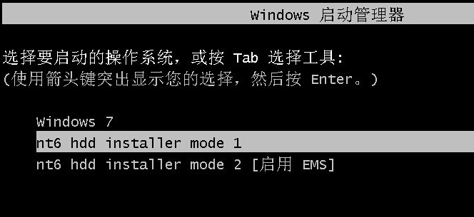 4、重启出现启动管理器界面,选择第二项【nt6 hdd installer mode 1】