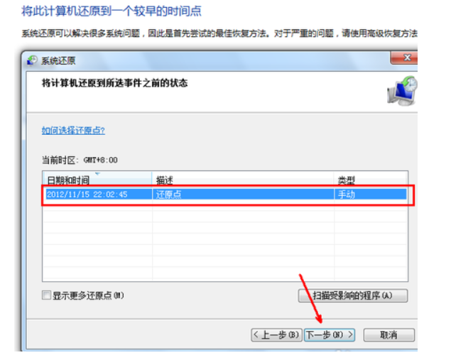 6、选择还原点,默认的初始的状态即可。