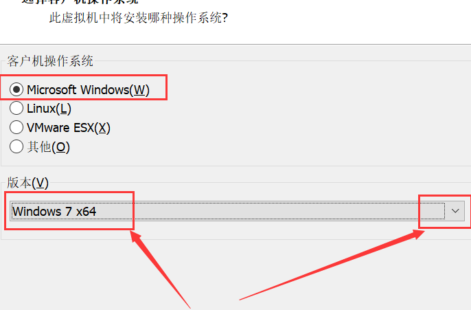 六、客户机操作系统选择windows,版本选择windows 7 x64。