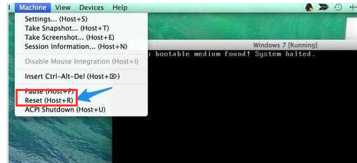 接下来我们在 Mac 系统的顶部 Virtual Box 的 “Machine” 菜单中,点击“Reset”选项(也可按键盘上的 command R 键),重新启动虚拟机
