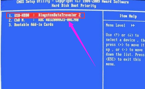 在高级BIOS设置(Advanced BIOS Features)界面里,首先点击(硬盘启动优先级)Hard Disk Boot Priority,之后即可进入BIOS开机启动项优先级选择,我们可以通过键盘上的上下键选择USB-HDD。