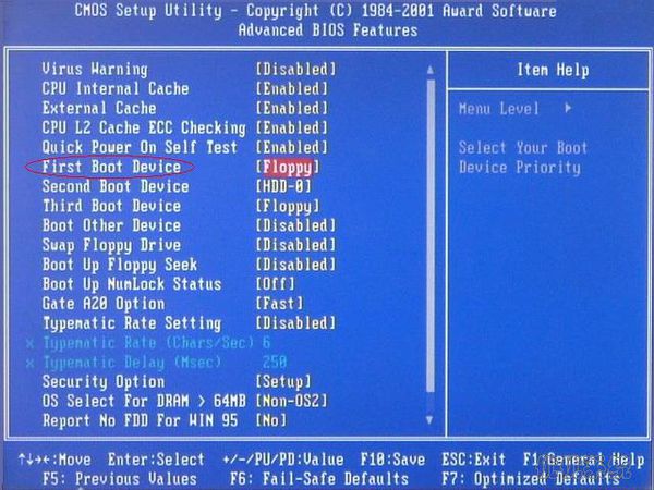 4、将“First Boot Device”项设置为“CDROM”即光盘,“Second Boot Device”项设置为“HDD-0”即默认硬盘。设置方法∶选“First Boot Device”项按“Enter”回车键。