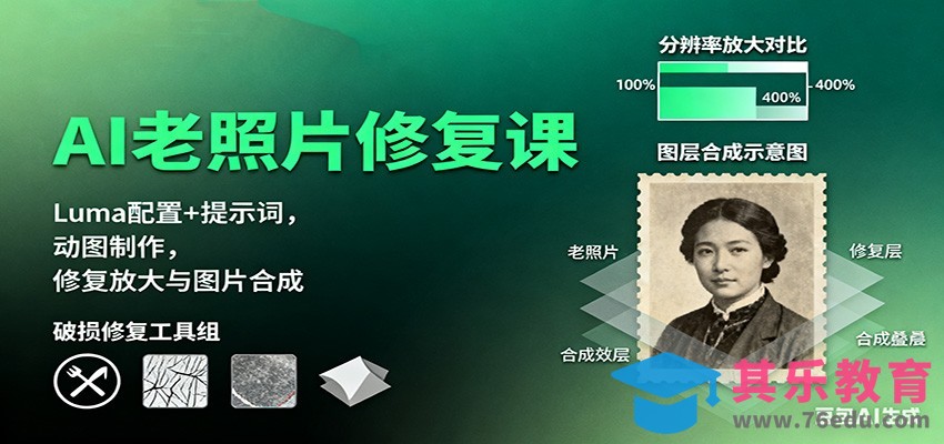 这是一门结合AI技术与传统修复技能的老照片处理全栈课程,系统教学老照片破损修复、黑白上色、高清放大等核心修复技术,同时涵盖AI动态生成、多图合成等创意应用,通过Luma、剪映等工具实操教学,帮助学员掌握从基础修复到高级动态效果制作的全套技能。