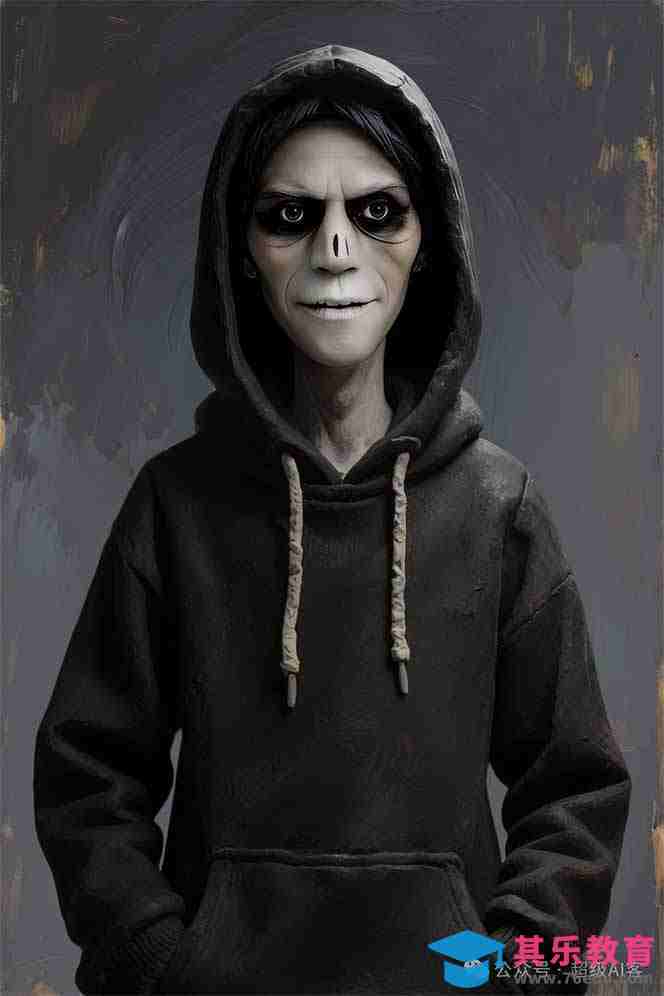 ***男子正对镜头,他的皮肤,是用厚涂技法(impasto)的油彩渲染出的病态惨灰白色,这个男子穿着一件黑色连帽衫)。强烈的明暗对照效果(Chiaroscuro)将他孤独的身影置于画面的视觉中心。
