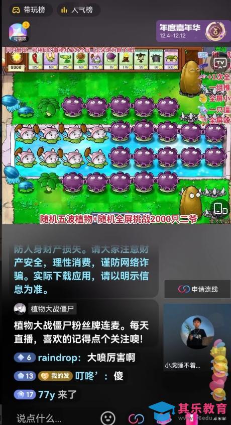这种直播玩法很容易吸引人,互动能力非常强,撸礼物效果非常好,在播的主播基本每天都有1000 的收入,有电脑,会玩植物大战僵尸就行,感兴趣的建议不要错过