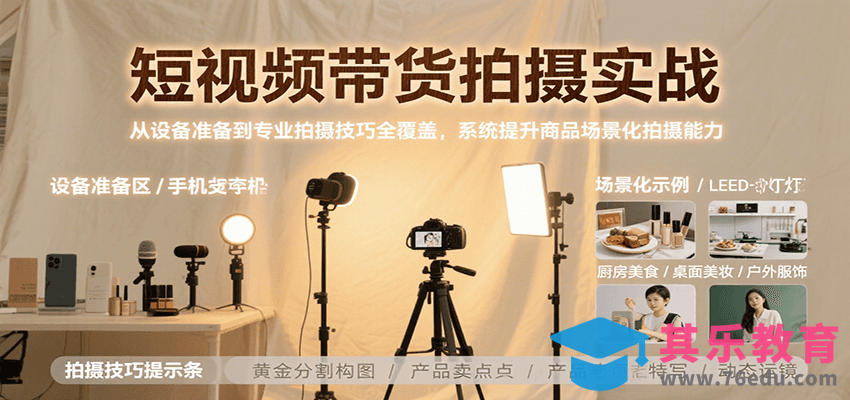 本课程是短视频带货拍摄的实战训练课程,从零基础设备准备到专业拍摄技巧全覆盖。课程包含四大核心模块:灯光场景搭建(三灯布光法、法式/简约风场景搭建)、专业拍摄技巧(构图/视角/机位选择)、Promovie软件实操(参数设置/对焦/白平衡)、后期剪辑调色(音效添加/字幕制作/食品/美妆类调色),通过家居/美妆/食品等实景案例教学,系统提升学员的商品场景化拍摄能力。